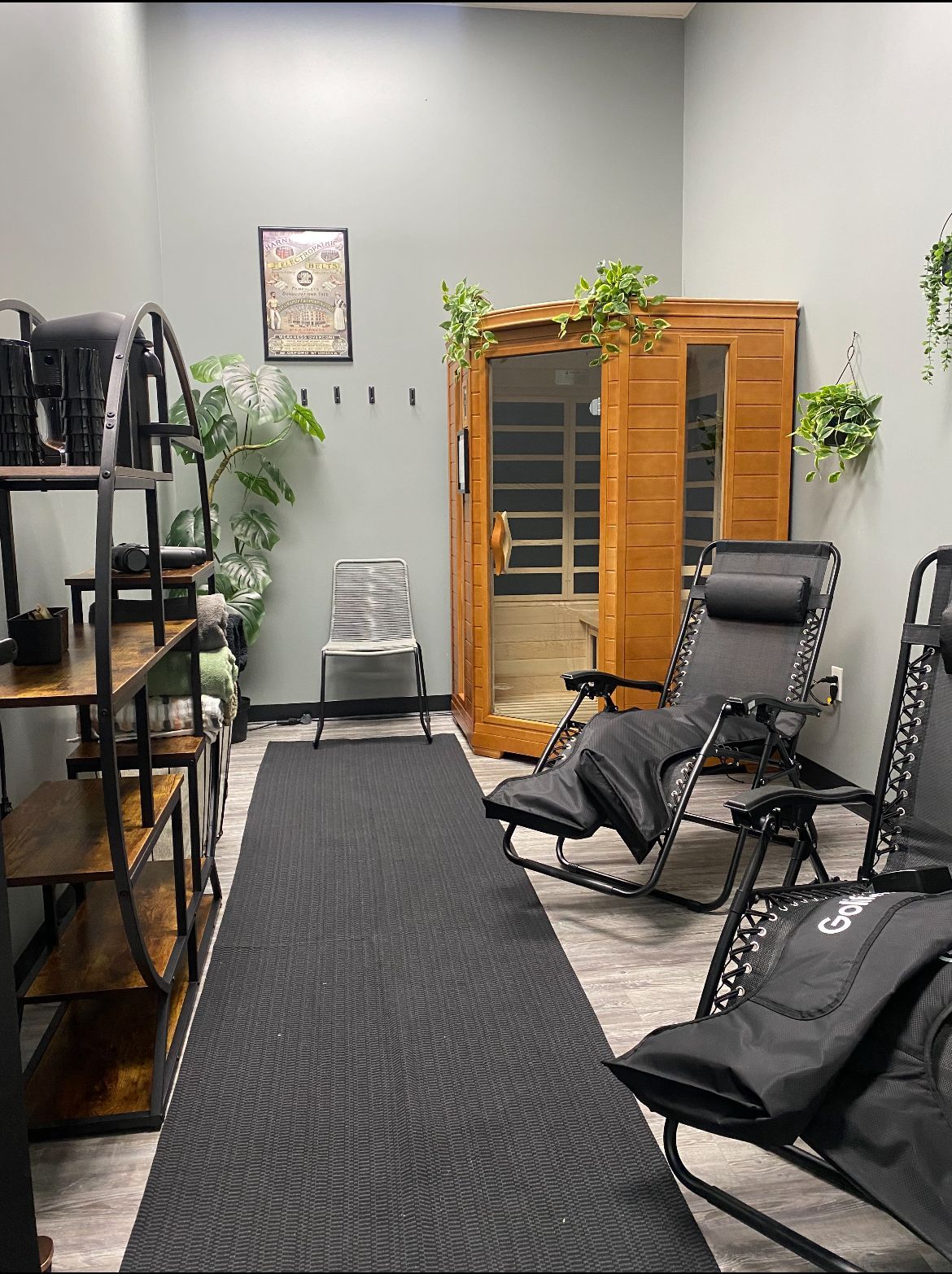 Designed like a sanctuary for the body after hard training or fatigue from life. It's quiet, calming and relaxing so your muscles can relax as you step inside. Step into the infrared sauna where the heat sinks deep into tired muscles. Climb into the reclining chair with compression boots and slip into them and the pulsing air chambers start their cycle - squeezing, releasing and pushing circulation through sore legs. Or grab a massage gun to work out the knots and tight spots for quick targeted relief. It's recovery at it's peak: a place to reset, recharge and walk out feeling stronger than when you came in.